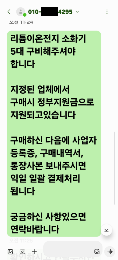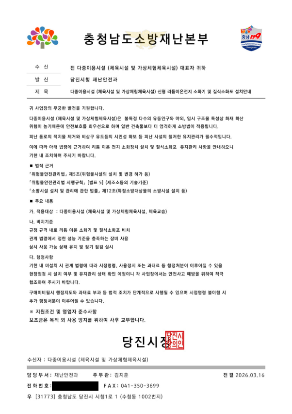 4. 사고내용 : 충청남도 당진시 공무원을 사칭하여 관내 체육시설업 업장에 위조 공문 및 명함(소방업체 및 공무원 명함)을 배포 후 물품(소화기, 질식소화포) 구매 강요(피해 사례 발생)